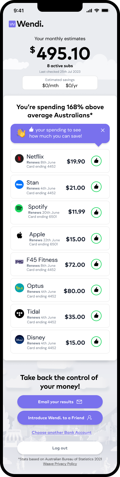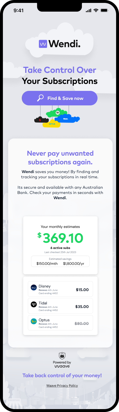 Identify duplicate and forgotten subscriptions. Wendi surfaces hidden costs so users save before Waave asks for anything.
