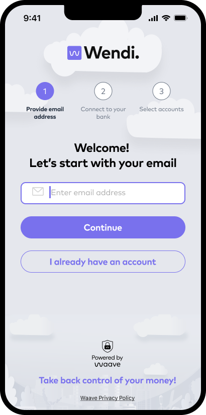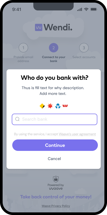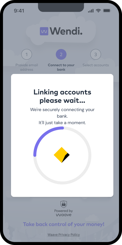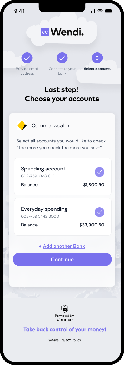 Waave's Wendi flow optimised the standard CDR model for subscription tracking, creating a seamless "value-first" experience. It started with a compelling pre-consent hook — "Never pay unwanted subscriptions again" — followed by minimal steps.