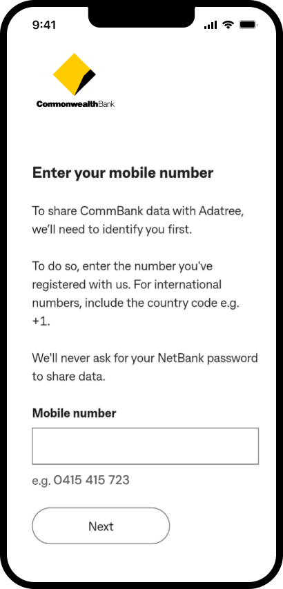 | Authenticate | Verify identity in data holder space | OTP mobile entry with reassurance ("never ask for password") |